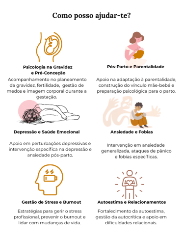 Com uma abordagem empática e especializada, dedico-me a apoiar o seu bem-estar em duas vertentes essenciais: a Psicologia Perinatal, acompanhando toda a jornada da maternidade (da pré-conceção ao pós-parto e parentalidade), e a Terapia de Adultos, focada na superação da ansiedade, gestão de stress, burnout e dificuldades relacionais.